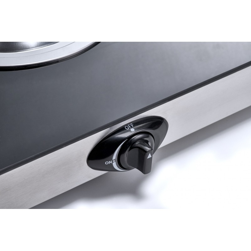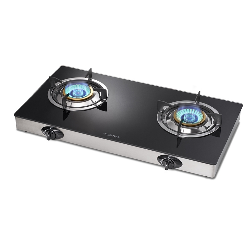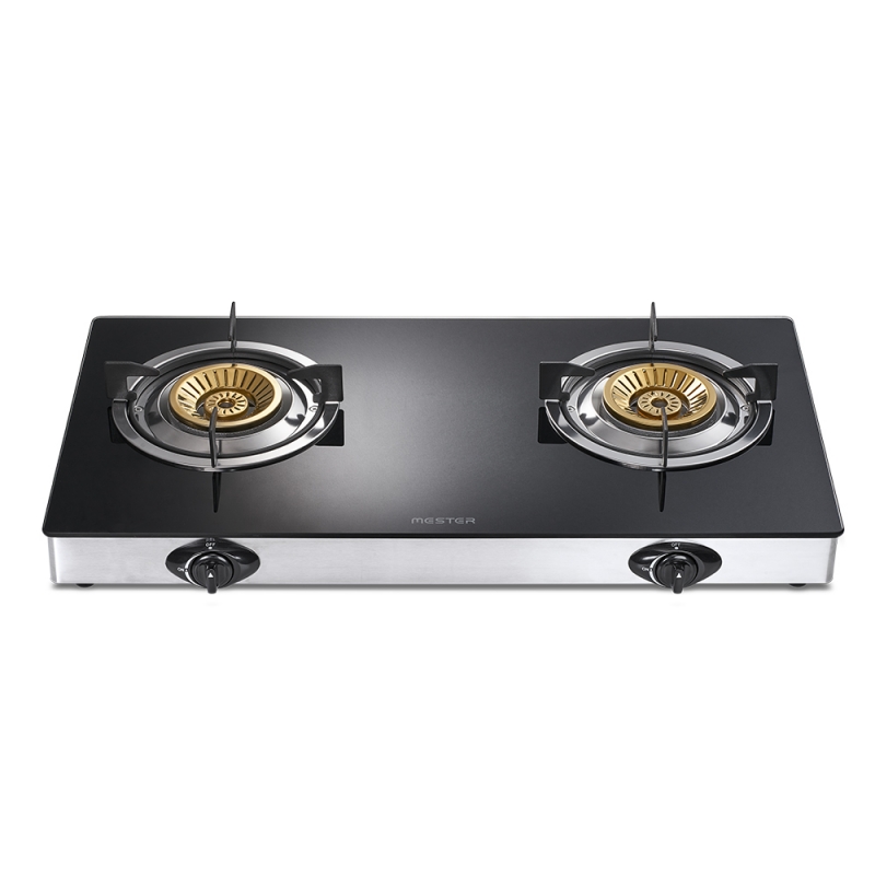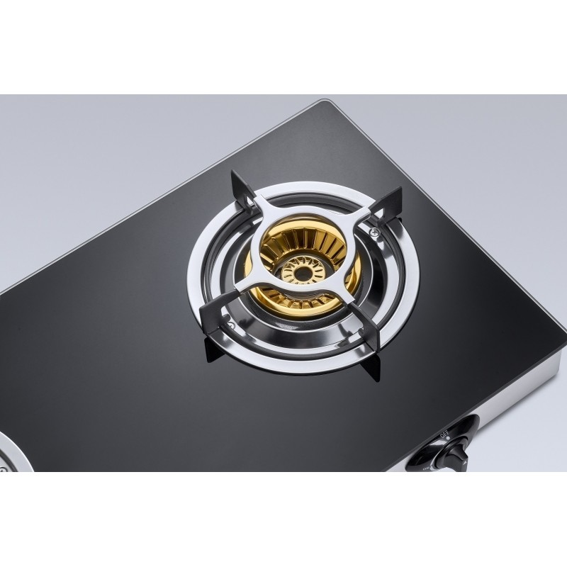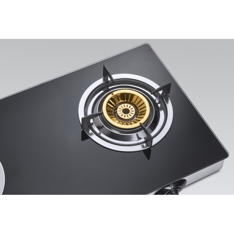 เตาแก๊สตั้งโต๊ะ หน้ากระจก หัวเตาแก๊สไทเทเนียม ท๊อปกระจกนิรภัยสีดำ 2 หัวเตาแก๊ส ประกอบด้วย ซ้าย : หัวเตาแก๊สไทเทเนียม กำลังไฟ 4,400 วัตต์ ขวา : หัวเตาแก๊สไทเทเนียม กำลังไฟ 4,400 วัตต์ ตัวเครื่องสเตนเลส สตีล แข็งแรง ตะแกรงรองภาชนะทำจากเหล็กหล่อ 2 ชิ้น มีอุปกรณ์เสริมสำหรับวางภาชนะขนาดเล็ก 1 ชิ้น จุดประกายไฟด้วยระบบลูกบิด